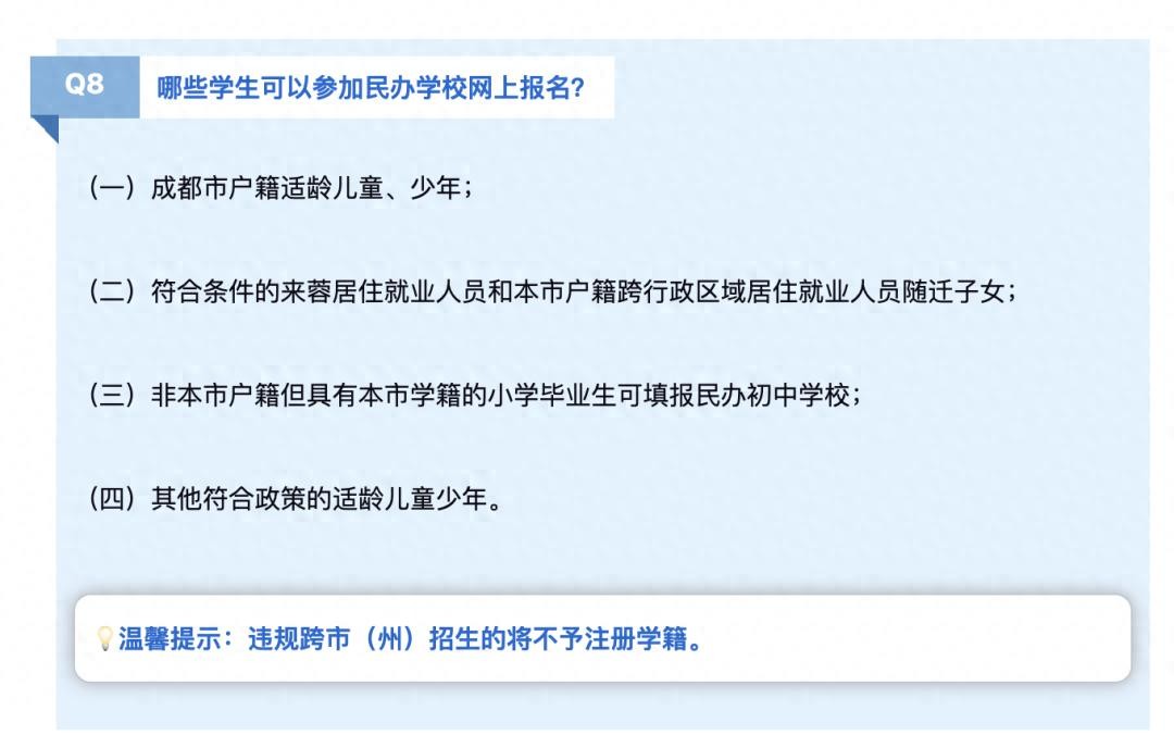 但对于民办小学来说,基本上没有锁区的限制,根据现目前成都的升学政策,成都户籍、随迁子女等符合条件的学生都可以填报一所成都民办小学。(但热门学校摇中率比较低)