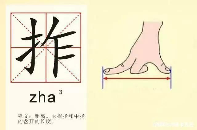 原来尺的单位长度是一拃,即拇指与掌叉开展平后拇指尖与中指尖之间的距离,如下图。