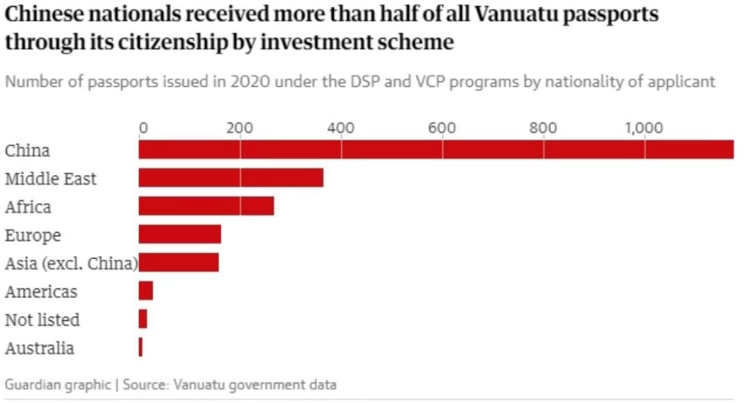 据英国《卫报》数据,2020年瓦努阿图发放的2200本护照有一半都发给了中国人。