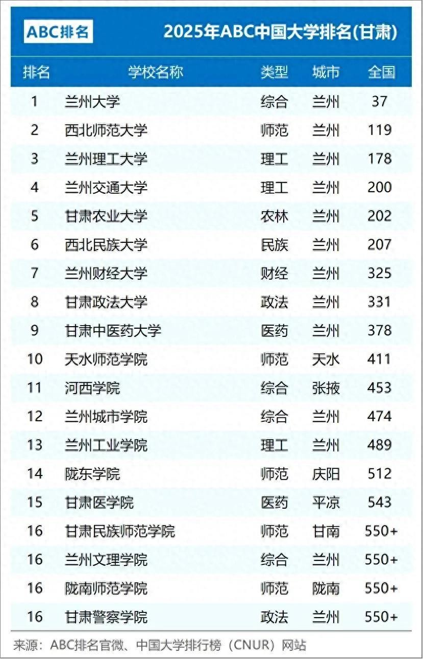 高等教育是地区发展的智力引擎,在国家创新驱动发展战略中发挥着重要作用。2025年ABC中国大学排名发布,为我们审视甘肃高校的整体实力与发展格局提供了一个窗口。这份榜单不仅展现了甘肃各高校在全国的位置,也反映出甘肃高等教育的特色与潜力。