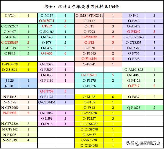 注:标红加粗的单倍群为在徐姓中较为富集的单倍群(一般为总人群平均水平的2倍左右及以上)