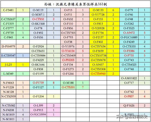 注:标红加粗的单倍群为在孙姓中较为富集的单倍群(一般为总人群平均水平的2倍左右及以上)