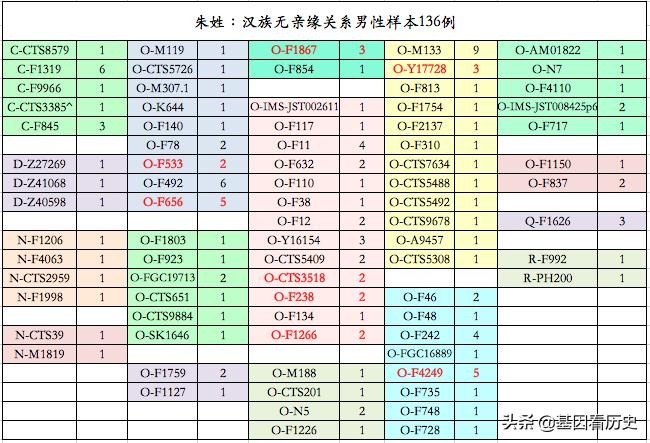 注:标红加粗的单倍群为在朱姓中较为富集的单倍群(一般为总人群平均水平的2倍左右及以上)