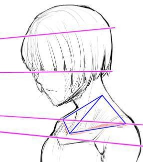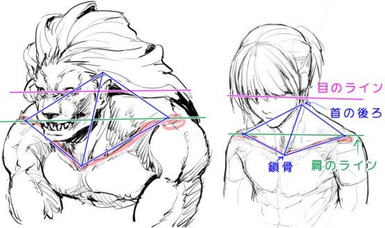为了稳定肩膀的拉伸,可以通过眼线(眼睛的那条线)为目标决定肩膀的线条。把锁骨做为基本,用菱形捉住肩膀周围的形状的话,偏差会减小。