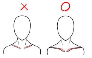 锁骨乍一看,像是从脖子以急角度向上移动,很容易画成左图那样。若是从脖子为起点向下移动的话,就会与肩膀顺畅地连接着。