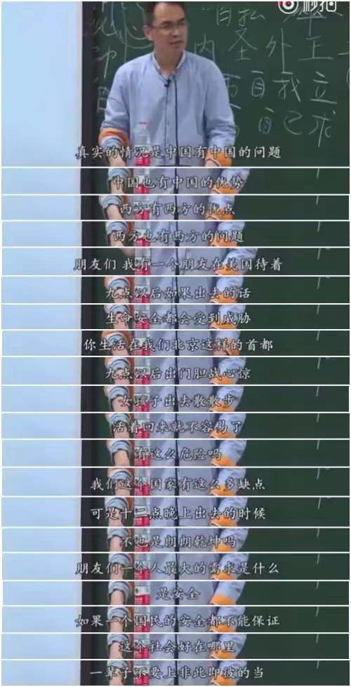 紧接着,这位老师还用了身边朋友的事实,强调了美国和北京晚上九点以后的居民心理活动。在美国,晚上九点后一般人是不愿意出门的,因为九点后出门自身的生命安全都会受到威胁;而来看看我们中国,就算晚上十二点出门撸串,外面也是朗朗乾坤。这位老师还反问:连一个过敏安全都保障不了的社会,到底好在哪里?
