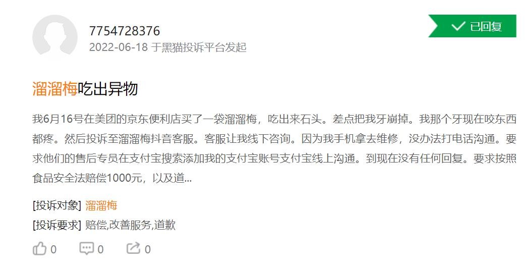 今年以来,溜溜梅的食品质量一直受到广泛关注。在黑猫投诉平台上,关于溜溜梅的质量投诉屡见不鲜,不断有消费者投诉在溜溜梅里吃出异物,甚至不乏有虫子、石子等异物。
