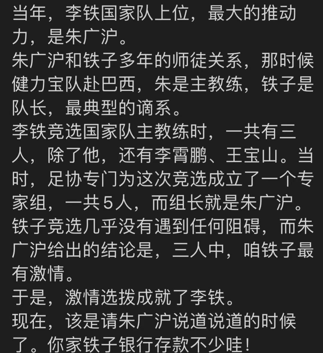 当年跟随健力宝去巴西留洋的时候,朱广沪是主教练,李铁是队长,两人是真正的师徒关系,李铁也是他真正的嫡系人员。