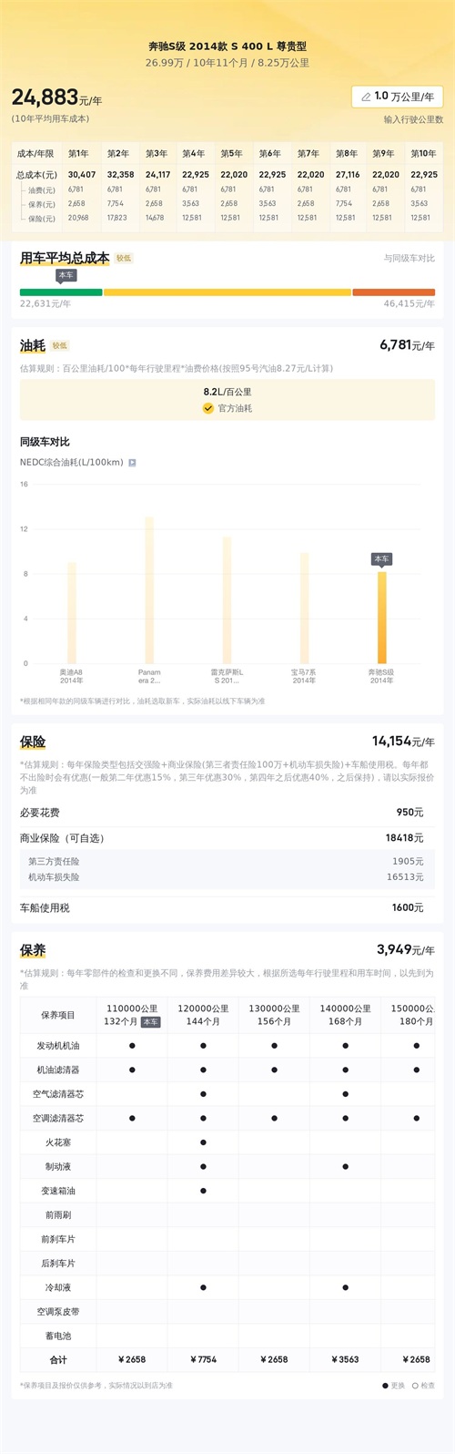 接下来,咱们聊聊这辆奔驰S级2014款S 400 L尊贵型的用车成本。根据估算,这辆车的年均综合用车成本约2.5万元左右。这里要说的是,这项花销跟车主的驾驶习惯和行车环境有着直接密切的关系。
