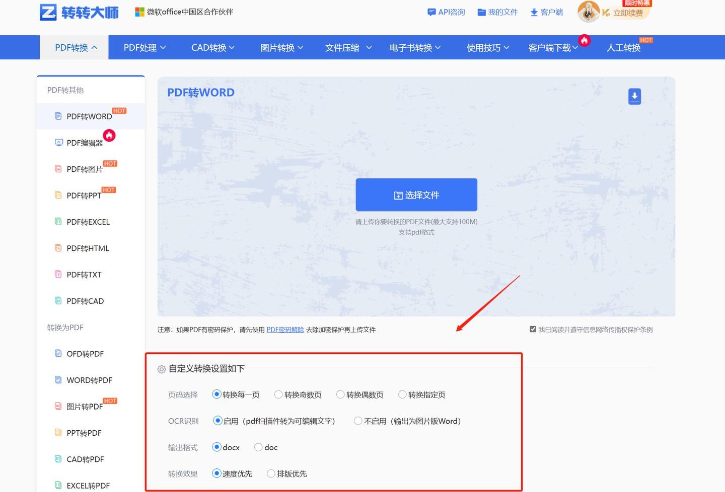 此功能可满足不同用户转换需求,可在PDF转Word转换开始前,进行输出页码选择(转换每一页/奇数页/偶数页/指定页)以及输出Word格式选择(doc/docx),也可以根据不同转换效果设置速度优先还是排版优先。