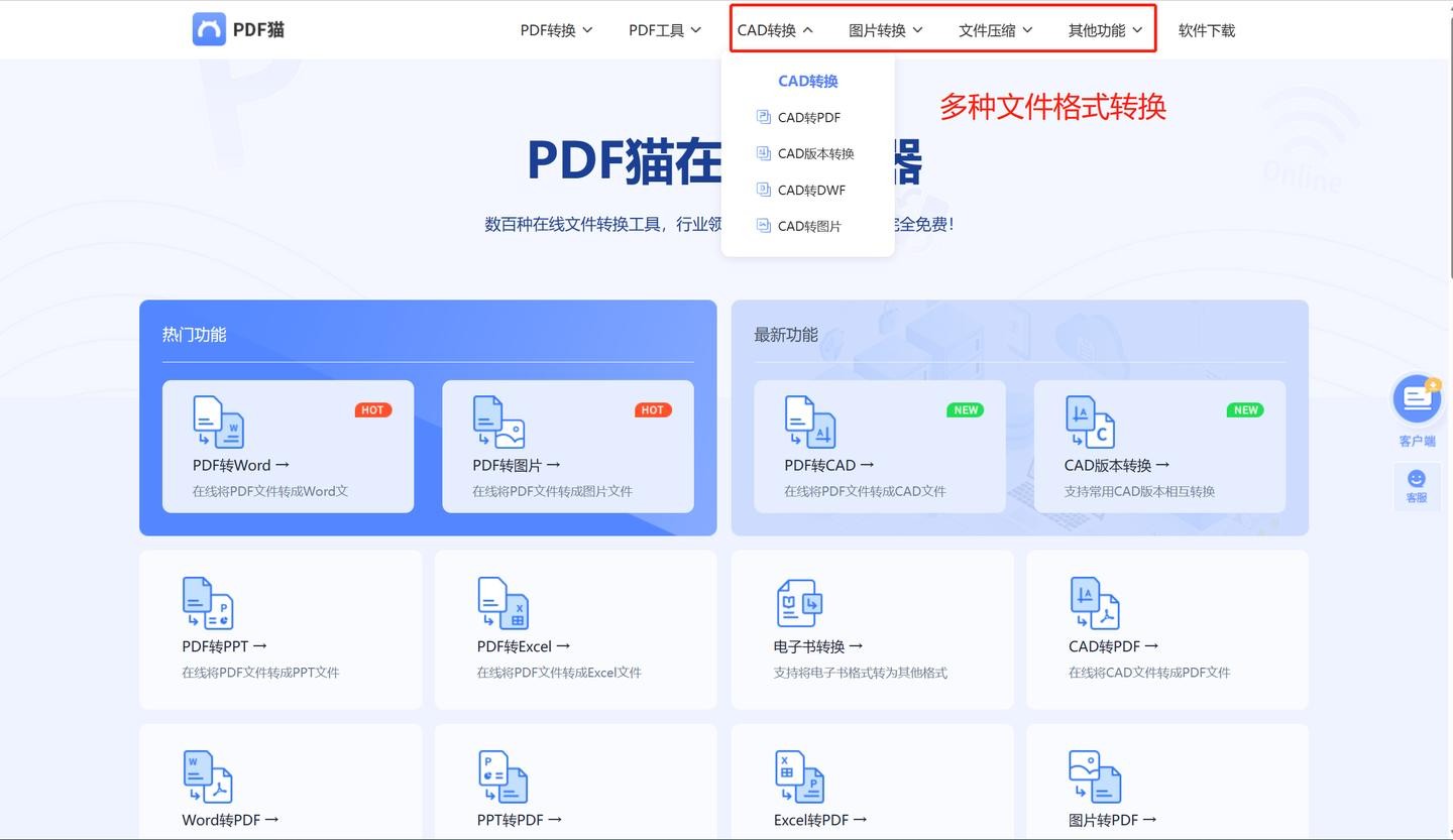 不仅仅是PDF文件转换,还支持CAD工程制图,图片格式文件,文件压缩等常用文档操作功能,相信很多小伙伴不仅仅需要文件转换功能,同时也需要对文件进行别的处理,那这款PDF猫转换器恰好可以满足大家的需求。