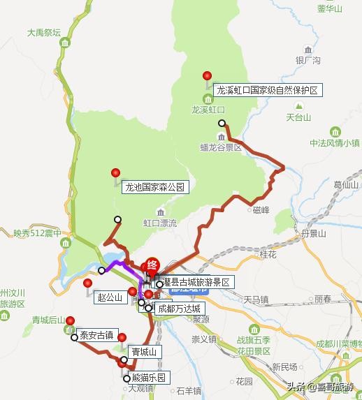 交通路线:熊猫乐园-大三路-药王路-环山路-药王山军区路-青城山路-泰安古镇。全长17.1公里,车程28分钟。