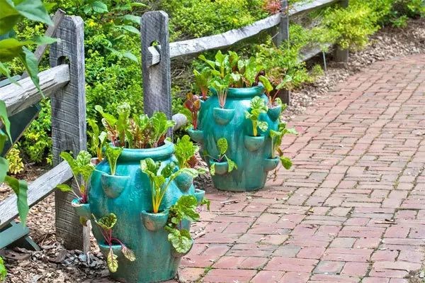 当然,除了花盆之外,旧水桶或回收的汽水瓶,甚至陶瓷碗都可以用作蔬菜容器,悬挂在墙面上,形成别致的空中菜园。