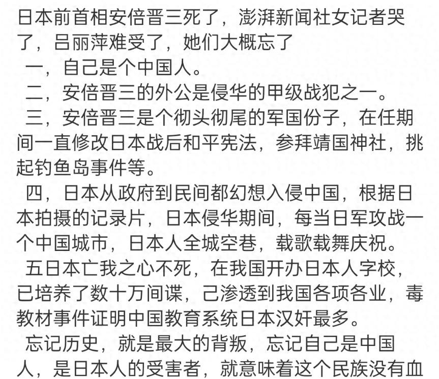 最令人震惊的事件发生在日本前首相安倍晋三遇刺的时候。在这个敏感时刻,吕丽萍发表了一篇长文,赞扬安倍晋三的"辉煌事迹",似乎对他的去世表示深深的惋惜。这个举动引起了更大范围内的愤怒,人们质疑吕丽萍对国家和历史的态度。