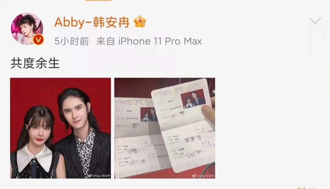 9月9日,网红韩安冉在社交平台官宣结婚喜讯,不仅晒出与老公的合照,还晒出了结婚证,官宣文案只配了四个字:“共度余生”!简短的需要却显得情深意切。