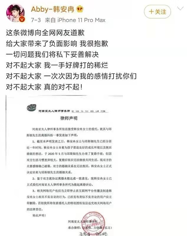 韩安冉当时也为复婚失败发文道歉,称:“我对不起大家,一手好牌打得稀烂”!