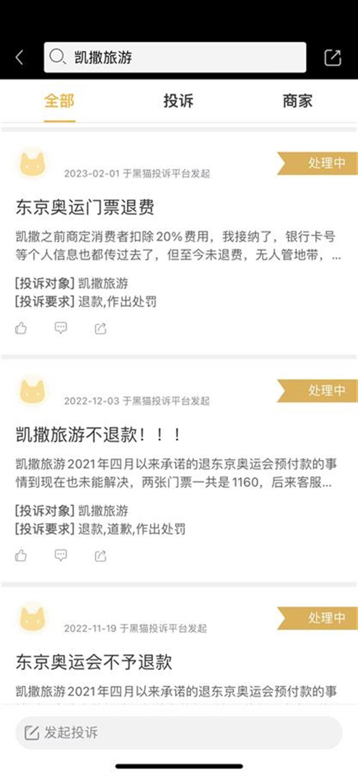 投诉平台上网友的相关投诉