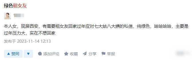 紧接着,讯息引发思考。若有法子兼顾回家与躲避亲戚追问,岂不美哉?此时,聪颖之人灵光一闪,提出了惊人建议——租赁女友。是的,您没有听错,即是借一位女性同行,以便从容应对喜欢追问的亲戚。