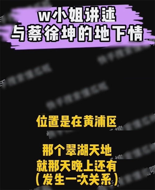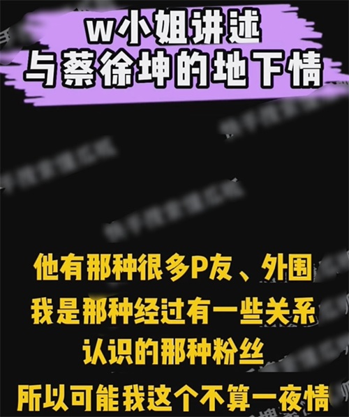 W女士爆料称蔡徐坤有很多那种炮友,外围的联系方式,但是自己和那些人不一样,她是那种经过有一些关系认识的那种粉丝,所以自己可能不算一夜情。