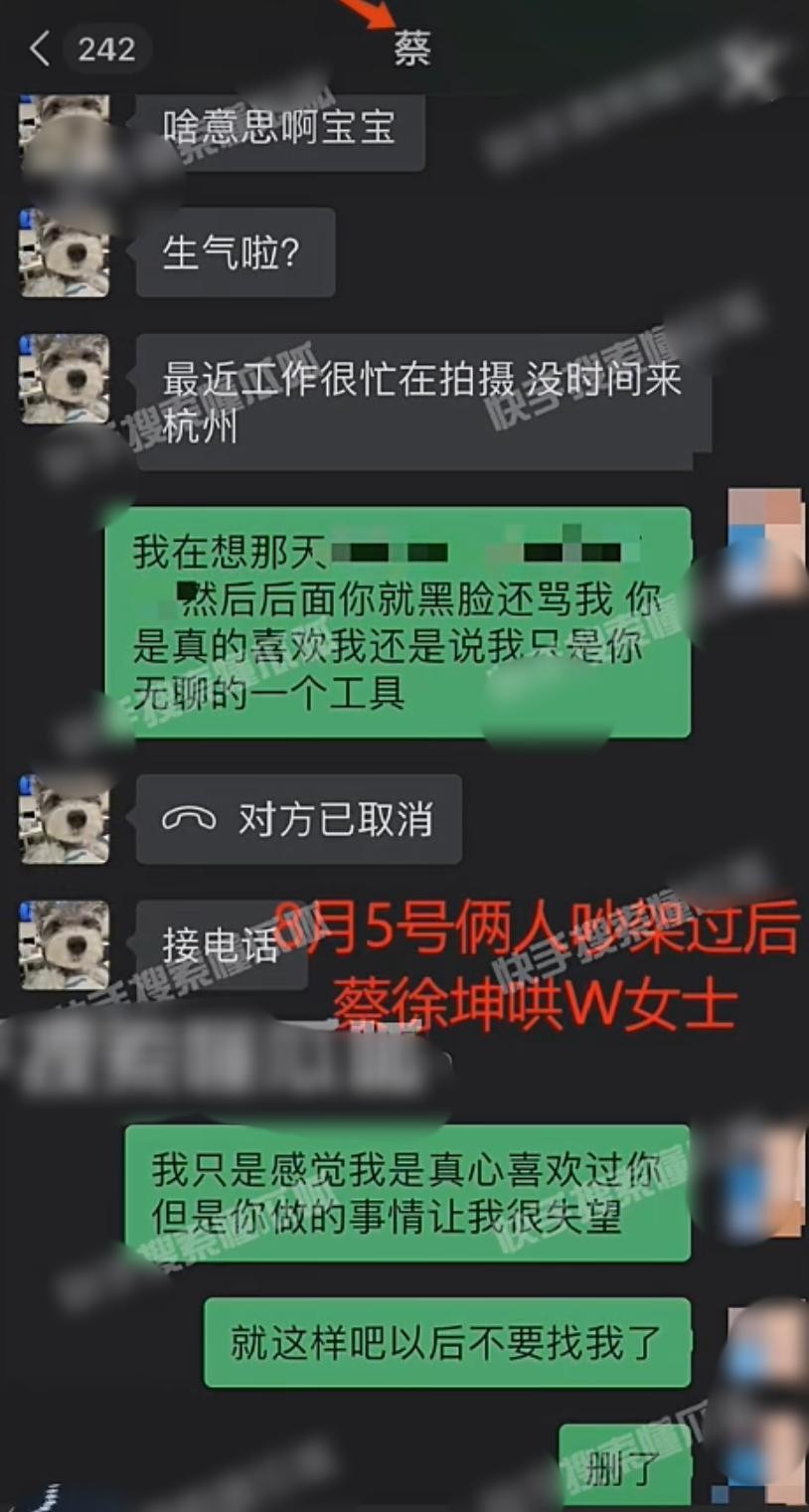 只是,这一次两个人发生了争执,不欢而散,之后,蔡徐坤也有在微信上给W女士发消息,口口声声叫着“宝宝”,还霸总语气叫对方“接电话”。