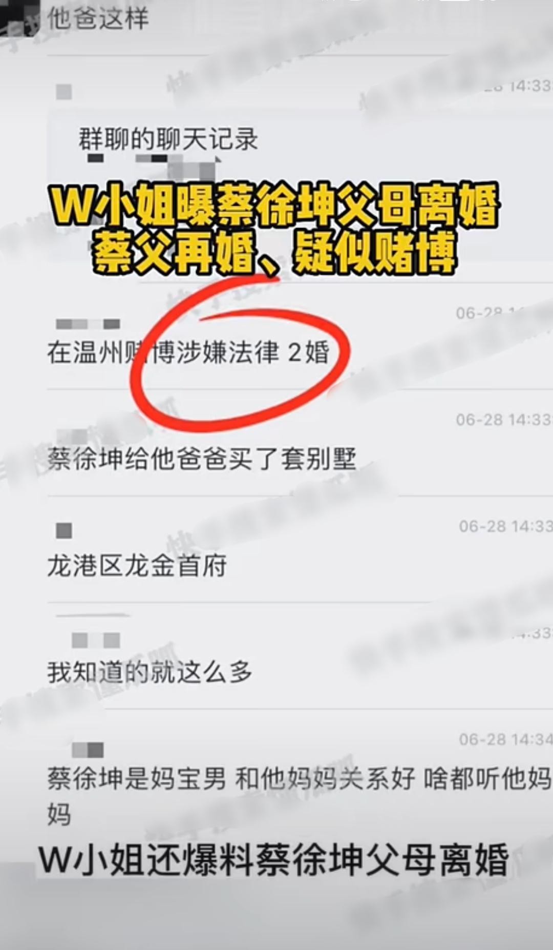 除了讲述自己和蔡徐坤之间的来龙去脉之外,W女士还向娱记爆料称蔡徐坤的爸爸在温州“赌博涉嫌法律,蔡徐坤给他爸爸买了套别墅,在龙港区龙金首府,蔡徐坤是妈宝男,和他妈妈关系好,啥都听他妈妈的”。
