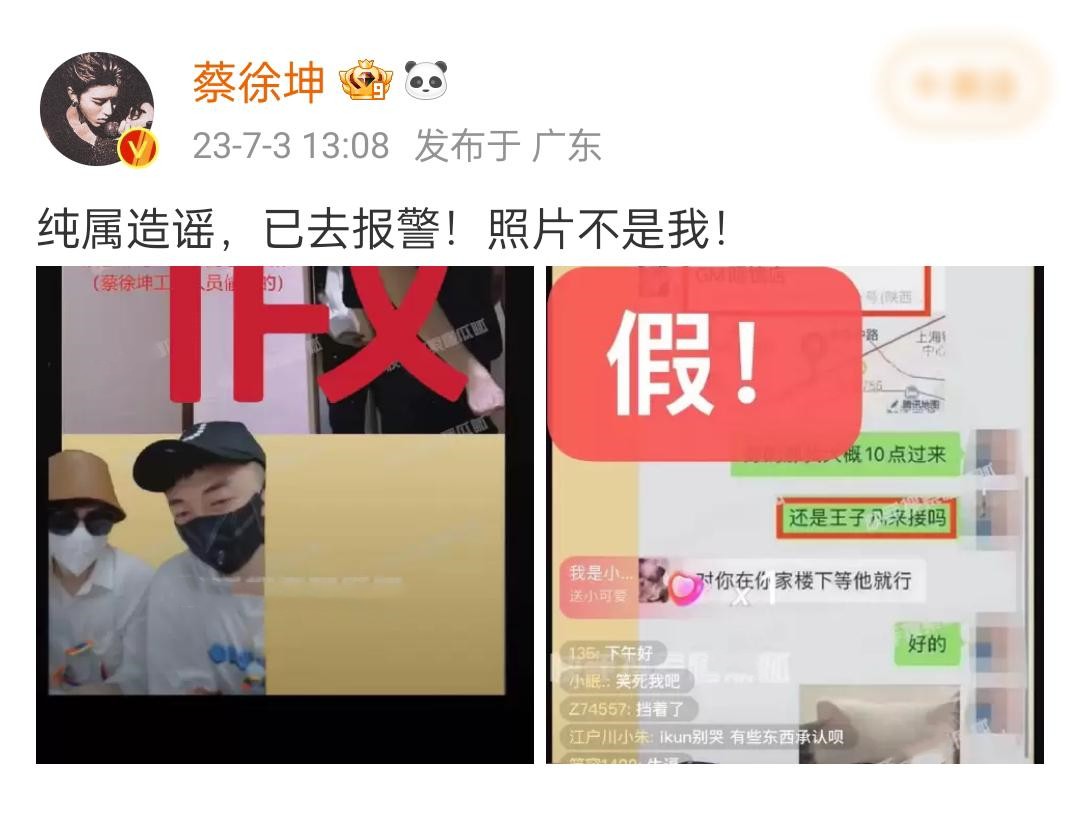 这一次,蔡徐坤没有任凭舆论不断发酵,而是在娱记直播尚未结束的时候就在社交平台回应称“纯属造谣,已经报警”,并且表示娱记曝光的W女士提供的照片里的男子不是他。