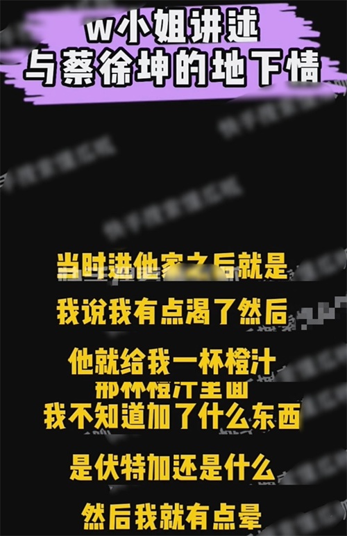 值得一提的是,在娱记提供的W女士讲述那晚经过的录音中,W女士当时进入蔡徐坤的家之后,就说自己有点渴了,然后蔡徐坤就给她倒了一杯橙汁,W女士称那杯橙汁里面不知道加了什么东西,是伏特加还是什么,她喝完之后就有点晕。