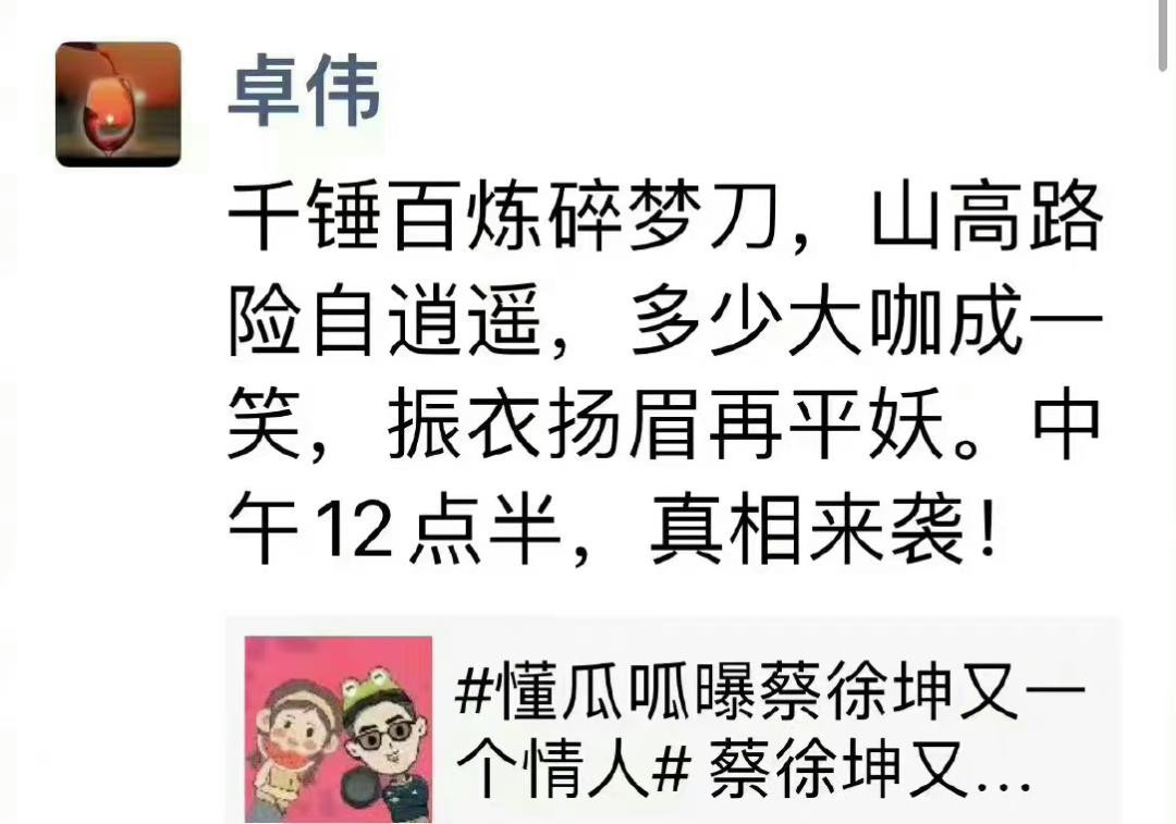 巧合的是,蔡徐坤发文回应的日子,正是娱记预告的曝光蔡徐坤另一个“小情人”的日子。