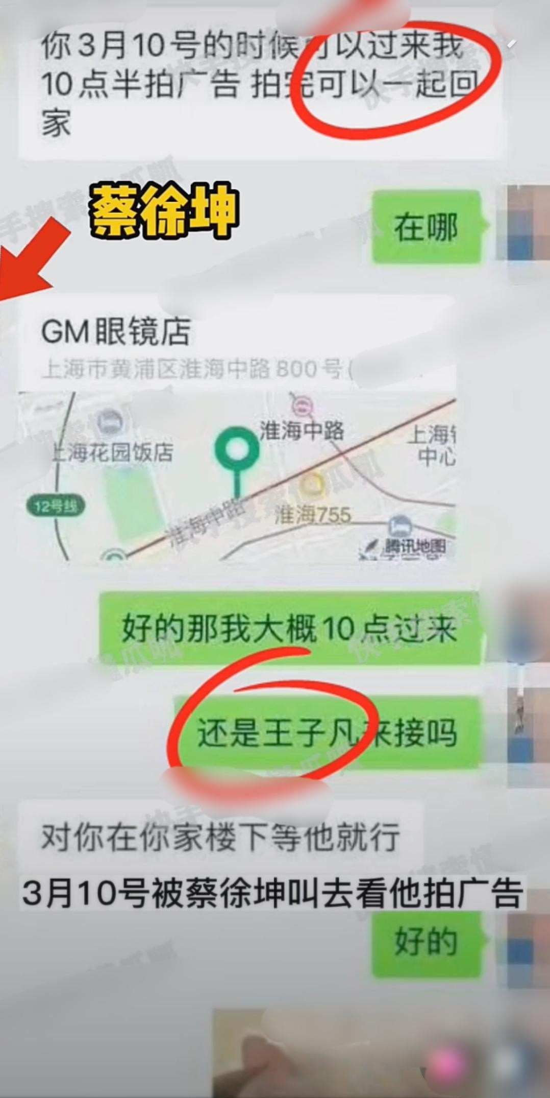 2022年蔡徐坤到上海参加品牌的活动,蔡徐坤发消息给W女士,称“你3月10号的时候可以过来,我10点半拍广告,拍完可以一起回家”,并且提供了自己拍广告的位置,就是“眼镜店”。