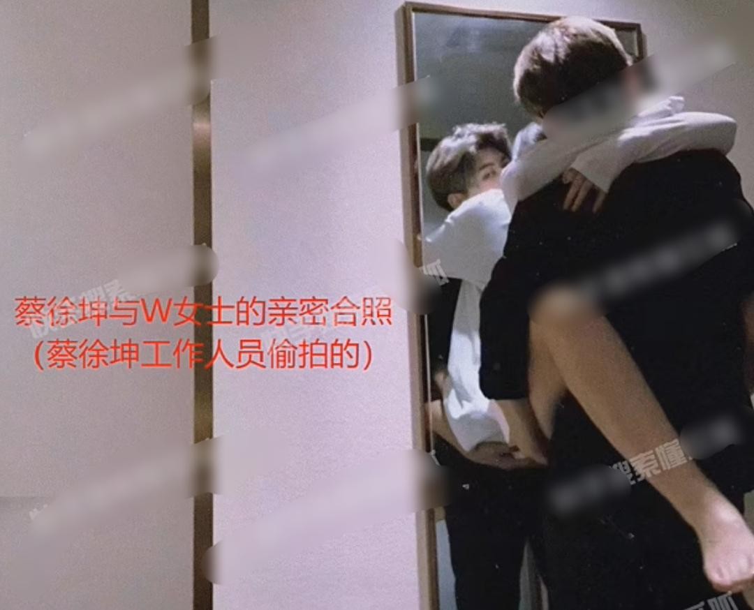 W女士向娱记提供了一张自己和蔡徐坤亲密拥抱的照片,照片中疑似是蔡徐坤的男子在镜子前面抱着一个女生,他的手托住女生的臀部,女生的双腿环住了他的腰,双手也紧紧地搂住了他的脖子。
