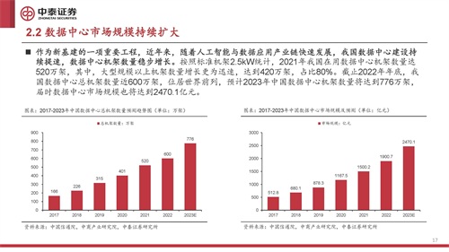 作为新基建的一项重要工程,近年来,随着人工智能与数据应用产业链快速发展,我国数据中心建设持 续提速,数据中心机架数量稳步增长。按照标准机架2.5kW统计,2021年我国在用数据中心机架数量达 520万架,其中,大型规模以上机架数量增长更为迅速,达到420万架,占比80%。截止2022年年底,我 国数据中心总机架数量近600万架,位居世界前列,预计2023年中国数据中心机架数量将达到776万架, 届时数据中心市场规模也将达到2470.1亿元。