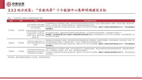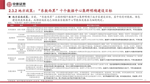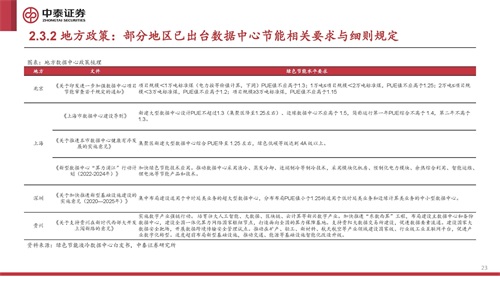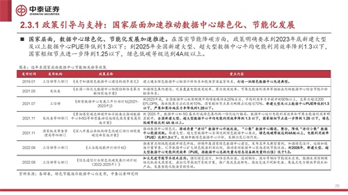 国家层面,数据中心绿色化、节能化发展加速推进。在落实节能降碳方面,政策明确要求到2023年底新建大型 及以上数据中心PUE降低到1.3以下;到2025年全国新建大型、超大型数据中心平均电能利用效率降到1.3以下, 国家枢纽节点进一步降到1.25以下,绿色低碳等级达到4A级以上。