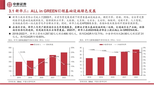 新华三技术有限公司成立于2003年,目前为紫光集团旗下的重要基础设施企业,拥有计算、存储、网络、安全等完整 的数字化基础设施提供能力,能够提供云计算、大数据、大互联、大安全、大安防、物联网、边缘计算、人工智能、 区块链在内的一站式数字化平台解决方案。同时,新华三也是HPE®服务器、存储和技术服务的中国独家提供商。 在液冷方面,新华三为用户提供液冷全生命周期服务,其解决方案从基础设施到统一运维,打通液冷全产业链,助推 液冷标准化的进程,实现液冷技术全场景覆盖。2023年,新华三在2023领航者峰会上提出ALL in GREEN战略。 2018-2022年,新华三营收从297.92亿元增至498.10亿元,期间CAGR为13.71%;归母净利润从24.90亿元增至37.31 亿元,期间CAGR为10.65%。