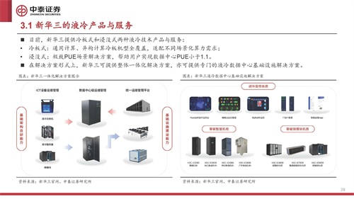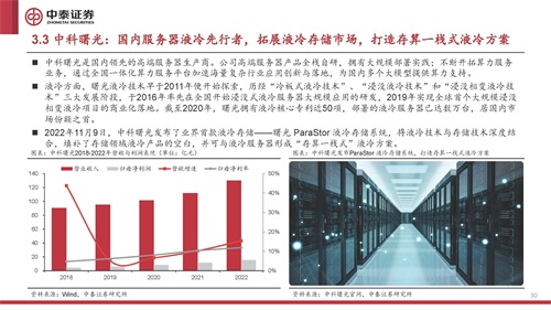 中科曙光是国内领先的高端服务器生产商。公司高端服务器产品全栈自研,拥有大规模部署实践;不断开拓算力服务 业务,通过全国一体化算力服务平台加速海量复杂行业应用创新与落地,为国内多个大模型提供算力支持。 液冷方面,曙光液冷技术早于2011年便开始探索,历经“冷板式液冷技术”、“浸没液冷技术”和“浸没相变液冷技 术”三大发展阶段,于2016年率先在全国开始浸没式液冷服务器大规模应用的研发,2019年实现全球首个大规模浸没 相变液冷项目的商业化落地。截至2020年,曙光拥有液冷核心专利近50项,部署的液冷服务器已达数万台,居国内市 场份额之首。 2022年11月9日,中科曙光发布了业界首款液冷存储——曙光 ParaStor 液冷存储系统,将液冷技术与存储技术深度结 合,填补了存储领域液冷产品的空白,并可与液冷服务器形成“存算一栈式”液冷方案。