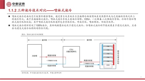 喷淋式液冷是面向芯片级器件精准喷淋,通过重力或系统压力直接将冷却液喷洒至发热器件或与之连接的导热元件上 的液冷形式,属于直接接触式液冷。喷淋式液冷系统主要由冷却塔、CDU、一次侧 & 二次侧液冷管路、冷却介质和喷 淋式液冷机柜组成;其中喷淋式液冷机柜通常包含管路系统、布液系统、喷淋模块、回液系统等。 喷淋式液冷同样实现了100%液冷,其结构颠覆性也优于浸没式液冷;但喷淋式液冷的节能效果差于浸没式液冷,且存 在与浸没式液冷相同的局限性问题。