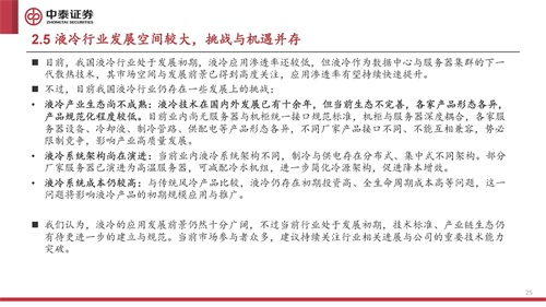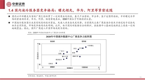 中国液冷服务器行业具有较高的技术壁垒,先进入者具备先发优势。目前国内主要厂商在液冷技术方面还处于试验或 初步应用阶段,市场竞争格局尚未明确。此外,由于国内对数据安全的保护,在数据中心基础设施供应上存在一定的 地域壁垒。因此,国外厂商进入中国市场或较为困难。