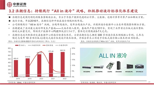 浪潮信息是国内领先的服务器制造企业,专注于为客户提供先进的云计算、大数据、边缘计算等计算产品和解决方案。 液冷方面,早在2016年,浪潮信息即开始在液冷领域积极布局。 公司持续践行“All in 液冷”战略,全栈布局液冷,发布全栈液冷产品,并提供液冷数据中心全生命周期整体解决方案。浪潮建成了亚洲最大液冷研发生产基地——天池并投入使用,基地年产能达10万台,实现了业界首次冷板式液冷整机 柜的大批量交付,帮助用户数据中心PUE降低至1.1以下,整体交付周期在5-7天之内。 浪潮信息还不断推动完善数据中心的液冷标准化体系,目前浪潮信息已拥有 300 多项液冷技术领域核心专利,已参与 制定与发布 10 余项冷板式/浸没式液冷相关设计技术标准,并联合牵头立项关于冷板式液冷核心技术的 4 项标准。