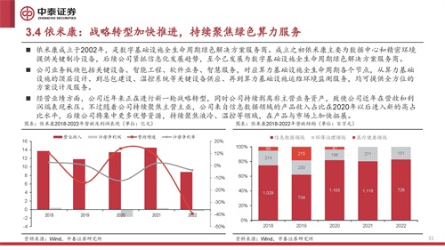 依米康成立于2002年,是数字基础设施全生命周期绿色解决方案服务商。成立之初依米康主要为数据中心和精密环境 提供关键制冷设备,后续公司紧抓信息化发展趋势,至今已发展为数字基础设施全生命周期绿色解决方案服务商。 公司业务板块包括关键设备、智能工程、软件业务、智慧服务,对应算力基础设施全生命周期各个节点,从算力基础 设施的顶层设计、到总包建设、温控系统等关键设备供应、再到算力基础设施运维环境监测服务,均可提供全方位的 方案设计及服务。 经营业绩方面,公司近年来正在进行新一轮战略转型,同时公司持续剥离非主营业务资产,致使公司近年在营收和利 润端表现承压。不过随着公司持续聚焦主营主业,公司来自信息数据领域的产品收入占比在2020年以后进入新的高占 比水平,后续公司将集中更多优势资源,持续聚焦液冷、温控等领域,在产品与市场上加快拓展。