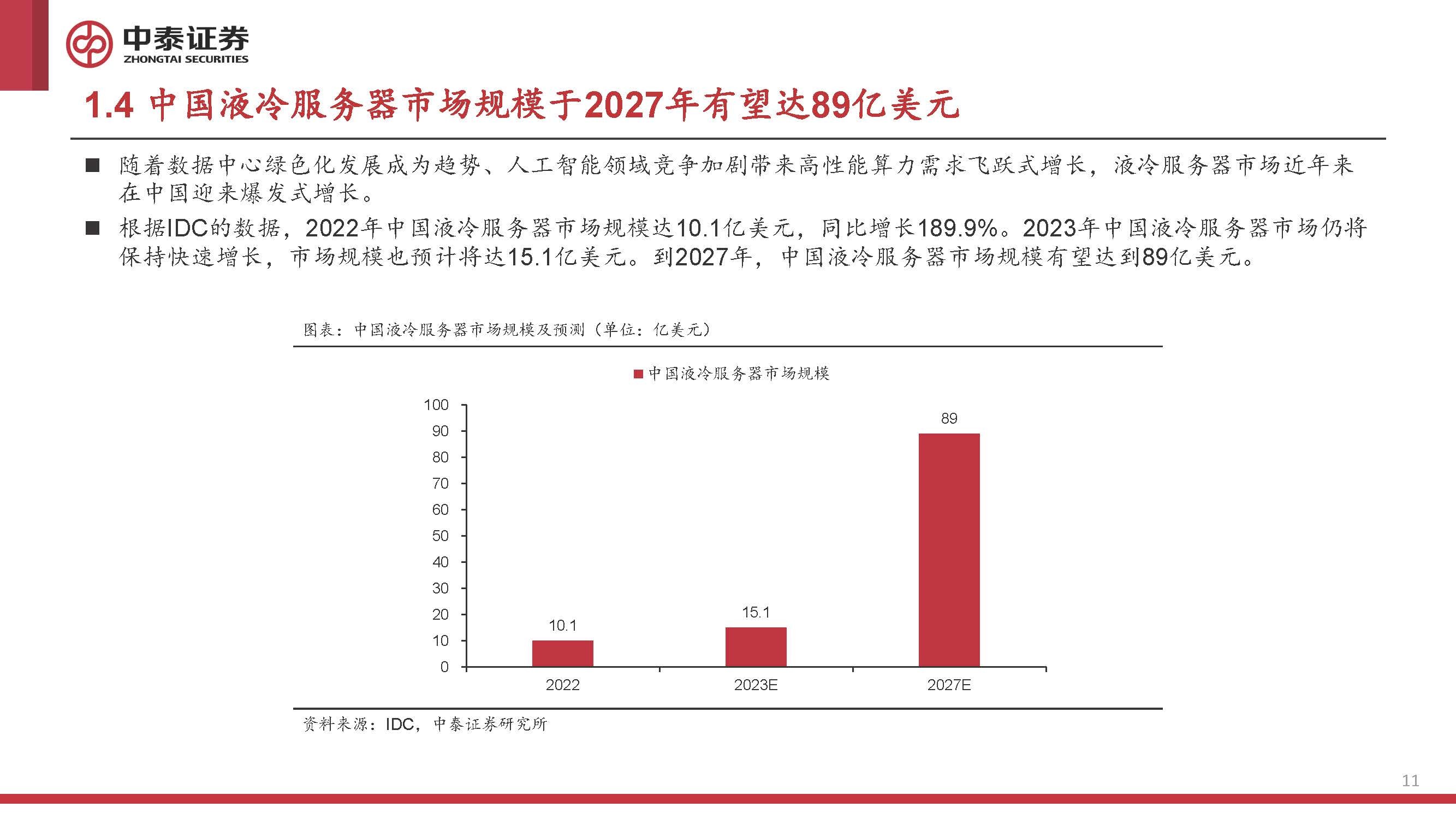 随着数据中心绿色化发展成为趋势、人工智能领域竞争加剧带来高性能算力需求飞跃式增长,液冷服务器市场近年来 在中国迎来爆发式增长。 根据IDC的数据,2022年中国液冷服务器市场规模达10.1亿美元,同比增长189.9%。2023年中国液冷服务器市场仍将 保持快速增长,市场规模也预计将达15.1亿美元。到2027年,中国液冷服务器市场规模有望达到89亿美元。