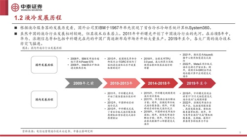 根据液冷服务器的发展历史看,国外公司里IBM于1967年率先实现了首台冷水冷却系统计算机System360。 虽然中国的液冷行业发展相对较晚,但其技术后来居上。2011年中科曙光开创了中国液冷行业的先河。在后续5年中, 华为、浪潮信息等和包括中科曙光在内的中国厂商逐渐布局市场并开始大量生产。2019年至今,各大厂商的液冷技术 亦突飞猛进。