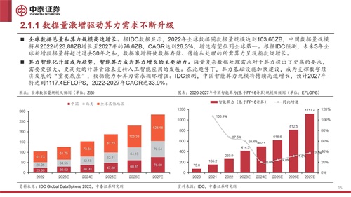 全球数据总量和算力规模高速增长。据IDC数据显示,2022年全球数据圈数据量规模达到103.66ZB,中国数据量规模 将从2022的23.88ZB增长至2027年的76.6ZB,CAGR达到26.3%,增速有望位列全球第一。根据IDC预测,未来3年全 球新增数据量将超过过去30年之和,数据激增将使数据存储、传输和处理的所需算力呈现指数级增长。