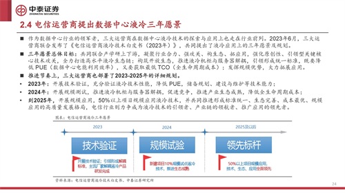 作为数据中心行业的领军者,三大运营商在数据中心液冷技术的探索与应用上也走在行业前列。2023年6月,三大运 营商联合发布了《电信运营商液冷技术白皮书(2023年)》,共同提出了液冷应用上的三年愿景及规划。 三年愿景总体目标:共同联合产学研上下游,凝聚行业合力、强攻关、构生态、拓应用,强化原创性、引领型关键核 心技术攻关,全力打造高水平液冷生态链;构筑开放生态,推进液冷机柜与服务器解耦,引领形成统一标准,既要降 低 PUE(数据中心电能利用效率),又要获取最低 TCO(全生命周期成本);发挥规模优势,大力拓展应用。