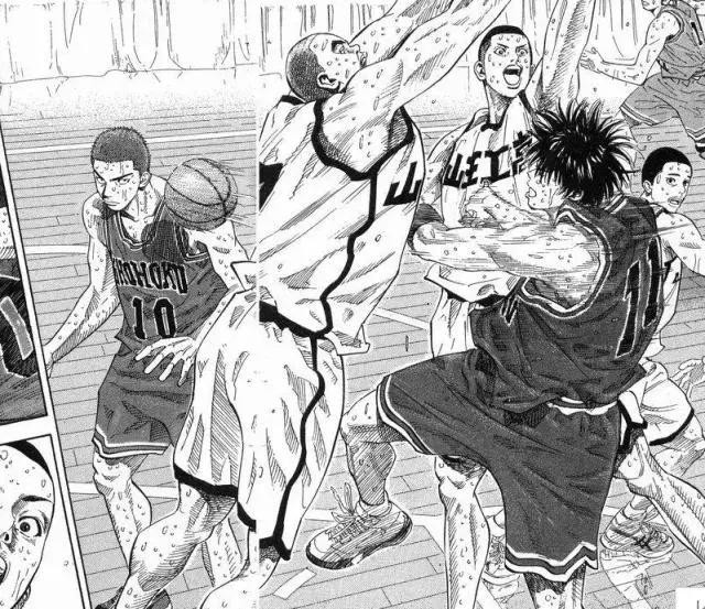 井上对于篮球环境的理解还是挺超前的,在那个时期,他不仅遵循当时得内线者得天下的大环境,同时也用大量笔墨描绘了些当时并不算是主流的球风,比如重视3分球(甚至还有超远3分),空间型内线(花型),跑轰战术(丰玉),现在回过头再看这些,似乎都在向我们提前预示篮球将会往小球时代发展的可能性。