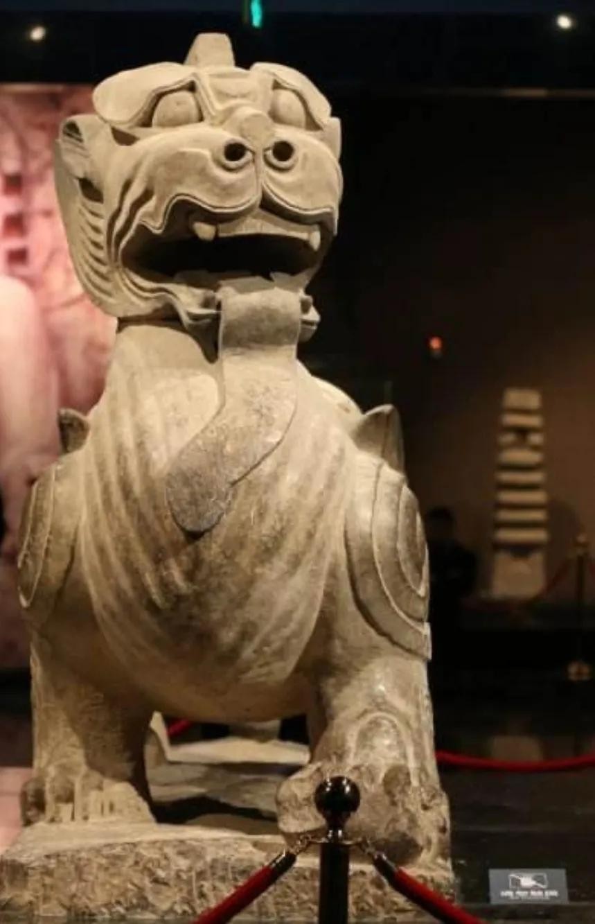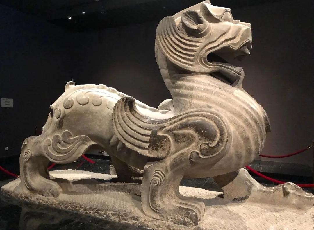 东汉石辟邪高109厘米,通长166 厘米。石灰岩质,圆雕。出土一对,另一件独角天禄现藏中国历史博物馆。石辟邪头颅似狮,高扬,怒张大嘴,露出十余颗极其粗硬的大牙,鼻子是典型的狮鼻,状如蒜瓣,鼻窦突起,鼻孔圆大;在鼻子之上用高浮雕手法表现出眼睛,这简直就是两个大铜铃,直瞪着前方;在眼睛旁边是耳朵,耳朵竖起,如扇,耳上生角;在其嘴下,以缀接形式捏塑了一束卷须,卷须粗大,像一个小柱子;躯干颇似虎,身长,腰细,臀宽;四足状如狮蹄,可以肯定是仿照狮子的四足塑造的。