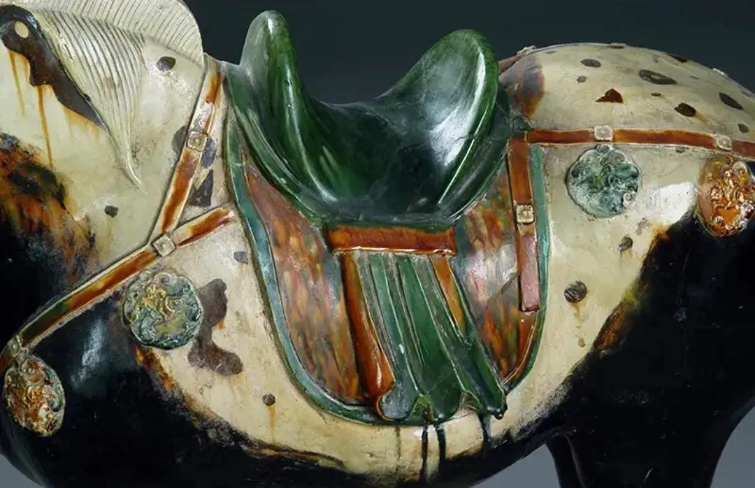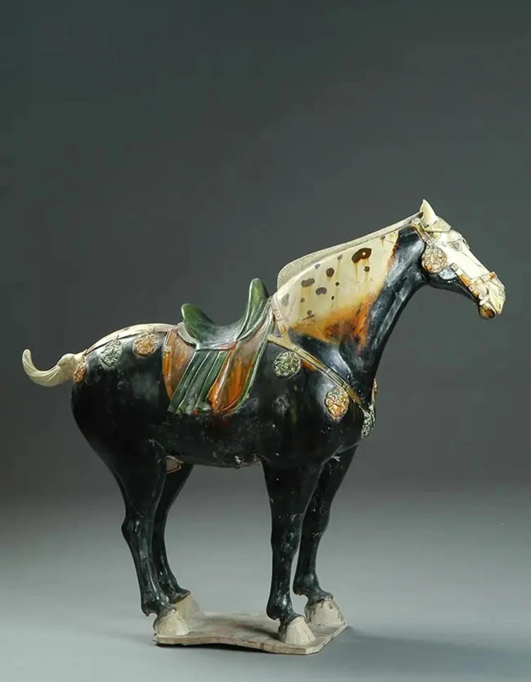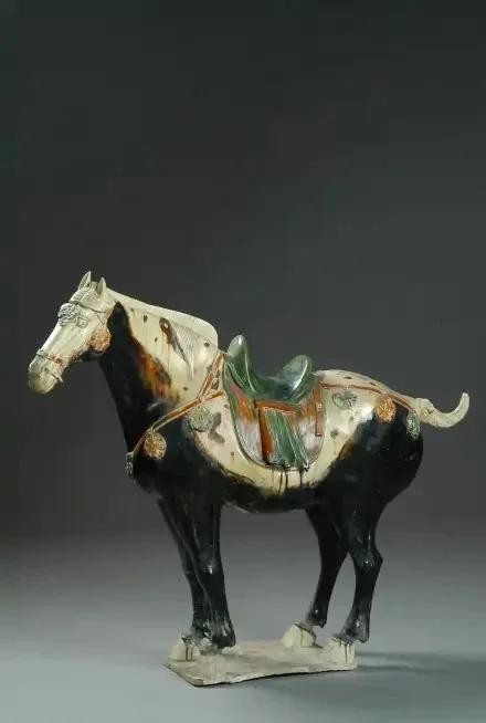 唐三彩黑釉马,高73、长84厘米,四足挺立,头颈上昂,眼视前方。全身黑色,唯马面、鬃、背、尾、蹄为白色,间施酱黄色花斑,马鞍鞯为绿、黄、白三色相间,背垫褐色釉的革带为饰,革带系绿色或棕色的圆形骑马浮雕垂饰15枚。