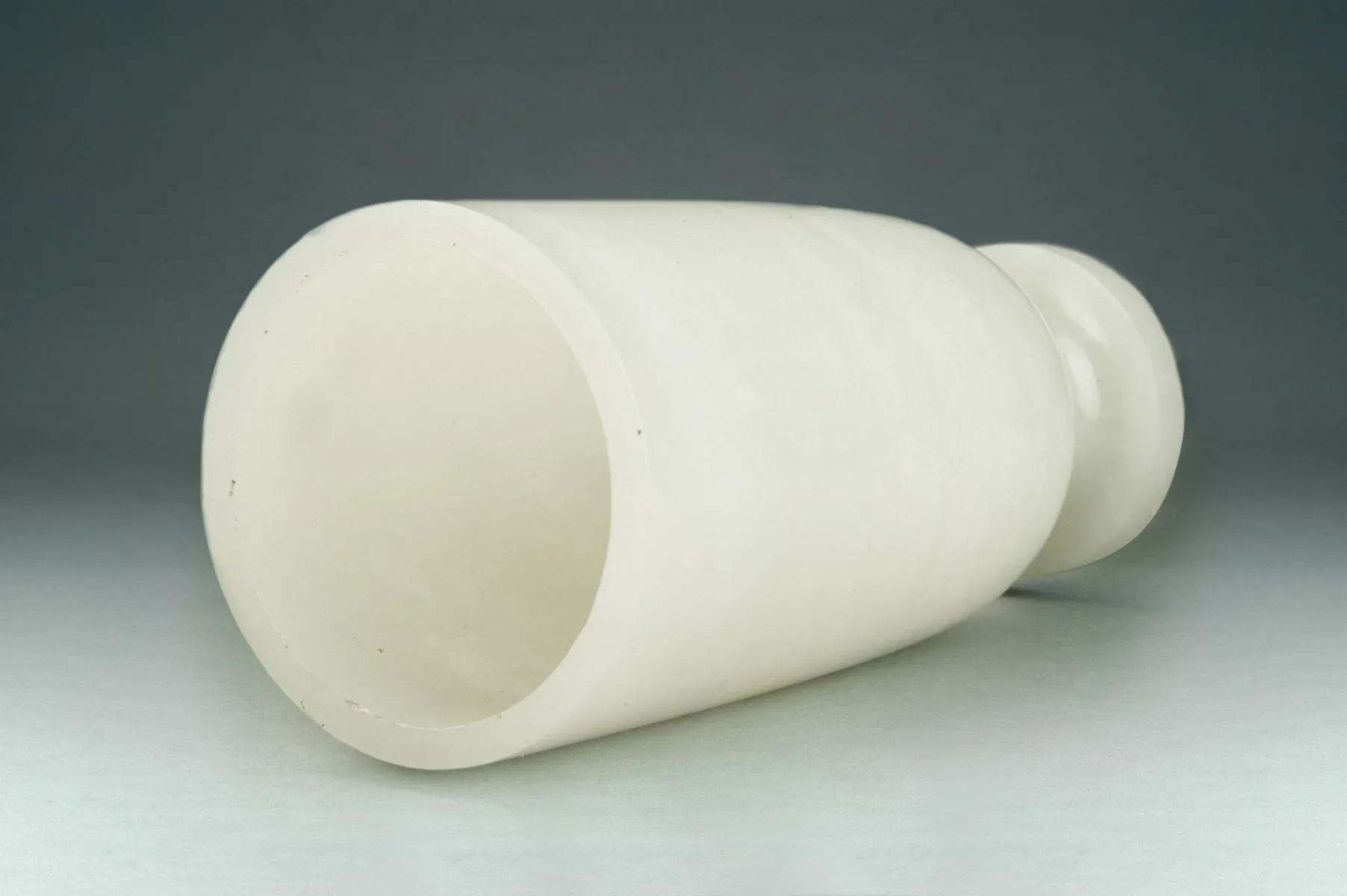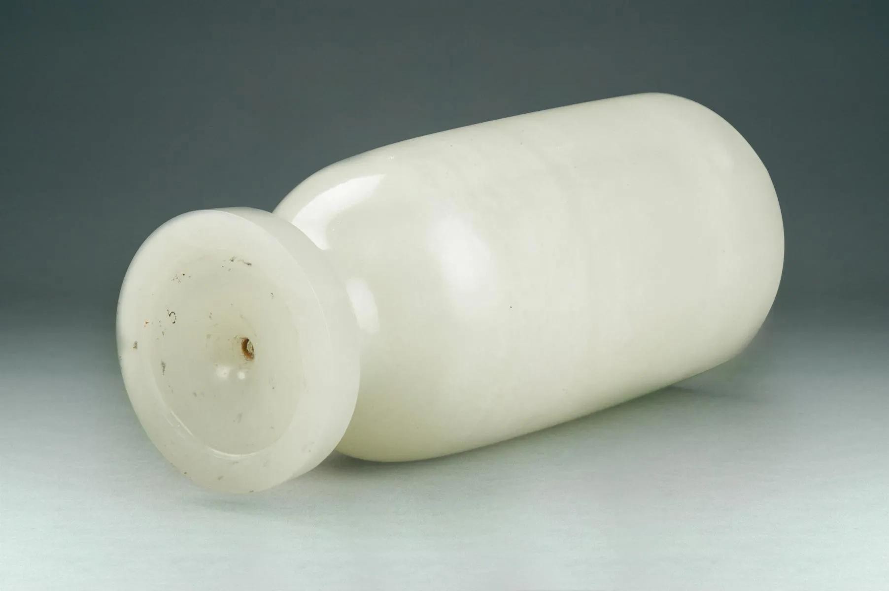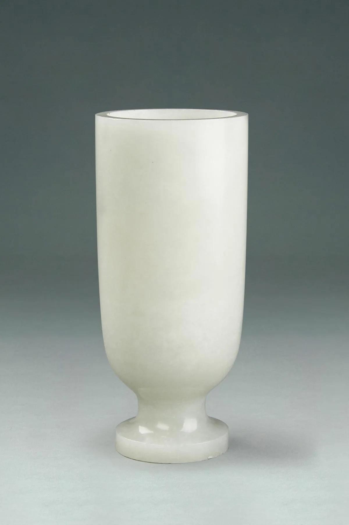经专家考证,白玉杯为墓主人生前饮酒的实用器。白玉杯杯高11.8厘米,口径5.2厘米,底径4厘米。玉杯呈圆筒形,直口,深直腹。通体以名贵的新疆和田羊脂玉琢制而成,玉质莹润细腻,杯壁厚薄均匀,杯身抛光极好,整体线条流畅,无纹饰,却尽显古朴雅致。