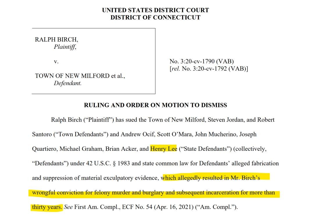 原告根据美国法典第 42 条第 1983 节和州法对李昌钰(“被告”)提起诉讼,指控被告捏造和隐匿了对原告有重要开脱作用的证据,这导致原告被错误定罪为重罪谋杀和入室盗窃,并被监禁了 30 年以上。