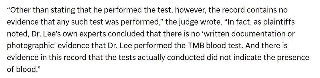 “除了声明他进行了测试外,记录中没有任何证据证明进行了这样的测试。实际上,正如原告指出的,李博士自己的专家得出结论,没有‘书面文件或照片’证明李进行了TMB血液测试。而且这份记录中的证据表明,实际进行的测试并没有显示有血液存在。”