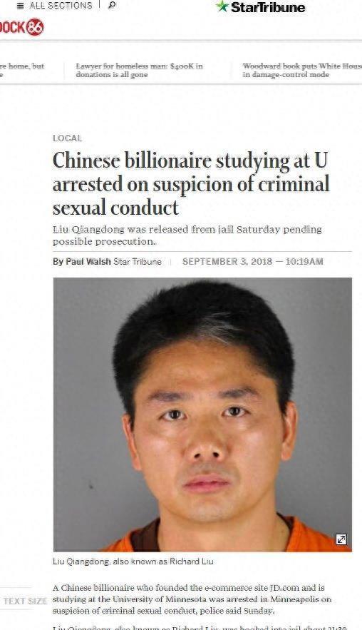 明尼阿波利斯警方周二表示,刘强东上周因涉嫌强奸被捕。警方报告称,刘强东因“609,342”罪名被捕——“性犯罪行为——强奸”。根据明尼苏达州法律,有 609,342 起属于一级犯罪性行为。他们继续调查这位企业家在明尼苏达大学居住期间的行为。