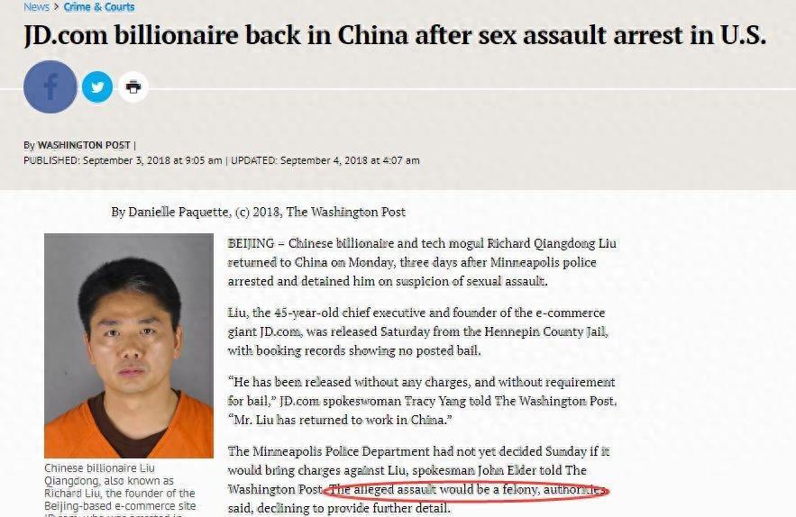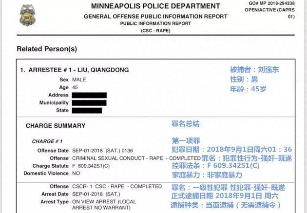 《纽约时报》当地时间9月4日报道,明尼阿波利斯警察局周二发布了案件报告,称刘强东上周五因强奸罪被捕。目前他已返回中国。当时,警方除了使用“犯罪性行为”一词外,没有提供更多细节。 “犯罪性行为”是指未经同意的一系列性接触。